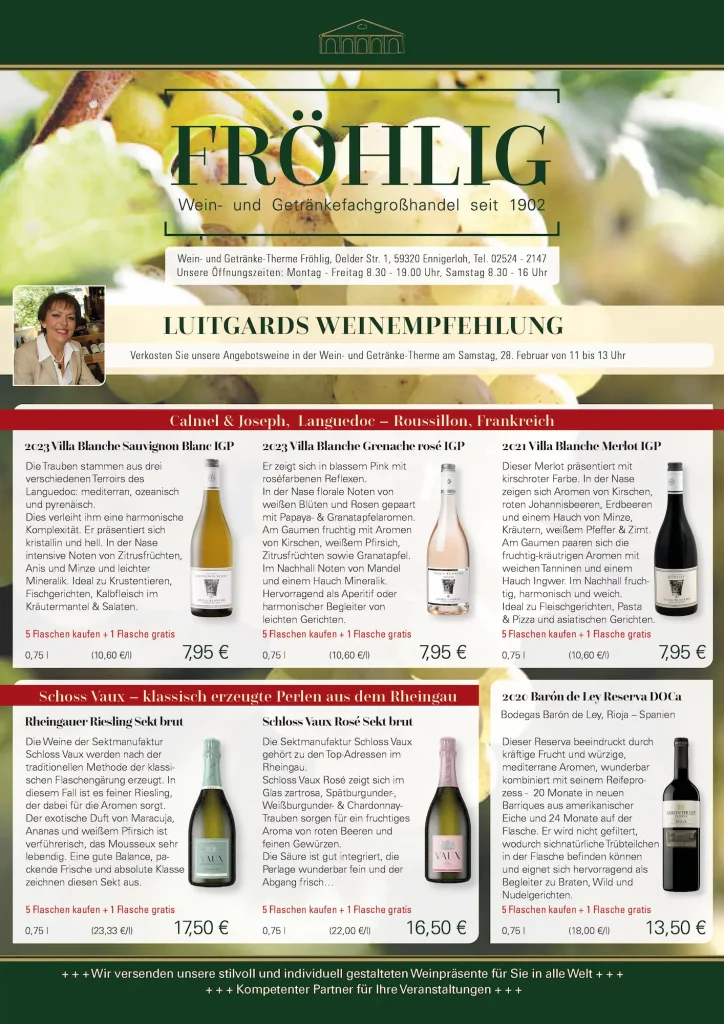 In der Wein- und Getränke-Therme Fröhlig finden Sie regelmäßig ausgewählte Angebote für jeden Anlass. Ob für den Alltag, das Wochenende mit der Familie oder die nächste Feier – wir bieten Ihnen eine vielfältige Auswahl an Bieren, Weinen, alkoholfreien Getränken und Spirituosen zu attraktiven Preisen.