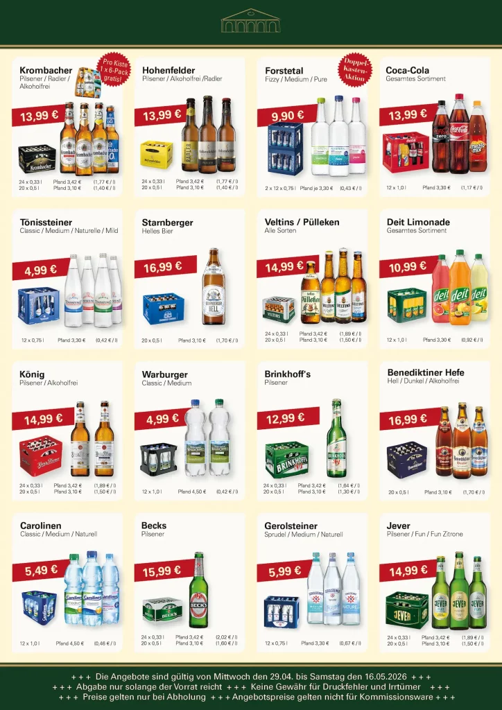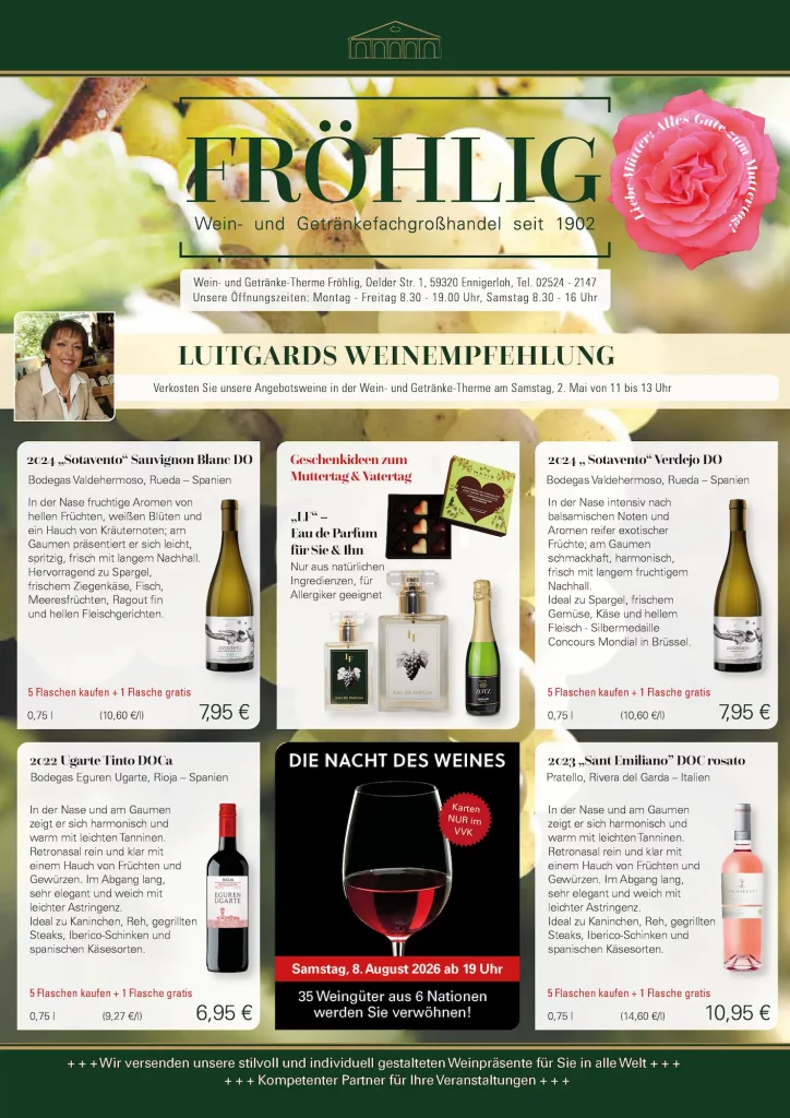 In der Wein- und Getränke-Therme Fröhlig finden Sie regelmäßig ausgewählte Angebote für jeden Anlass. Ob für den Alltag, das Wochenende mit der Familie oder die nächste Feier – wir bieten Ihnen eine vielfältige Auswahl an Bieren, Weinen, alkoholfreien Getränken und Spirituosen zu attraktiven Preisen.