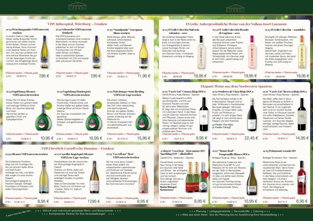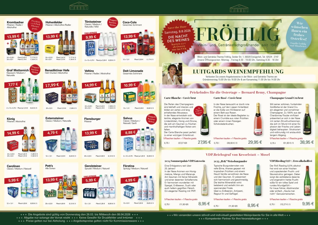In der Wein- und Getränke-Therme Fröhlig finden Sie regelmäßig ausgewählte Angebote für jeden Anlass. Ob für den Alltag, das Wochenende mit der Familie oder die nächste Feier – wir bieten Ihnen eine vielfältige Auswahl an Bieren, Weinen, alkoholfreien Getränken und Spirituosen zu attraktiven Preisen.